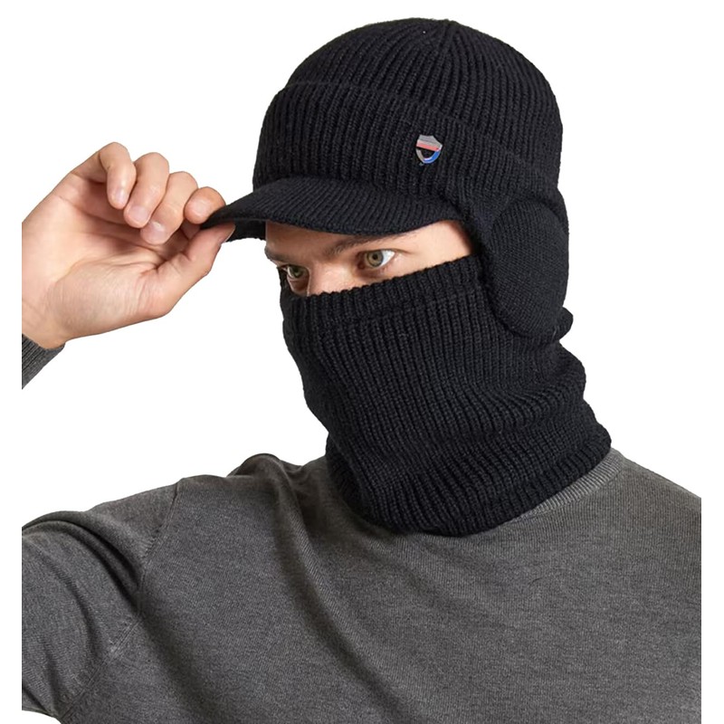 Men Winter Visor Beanie Hat with Scarf Set Warm Earflaps Winter Outdoor Hat Fleece Lined Knitted Skull Ski Masck Hat Black