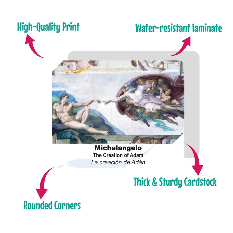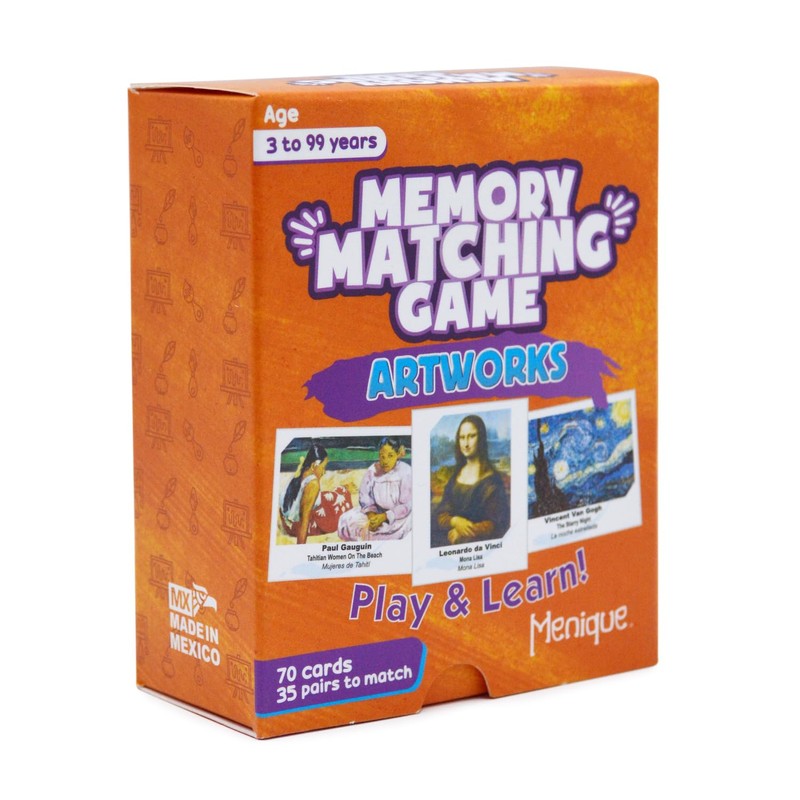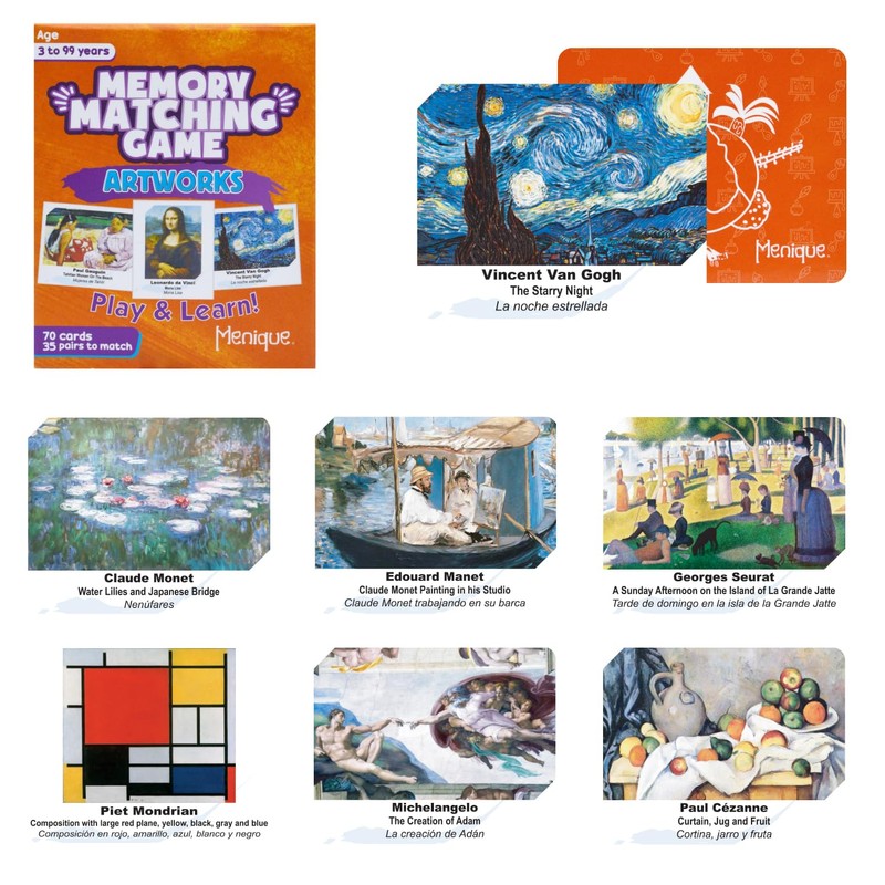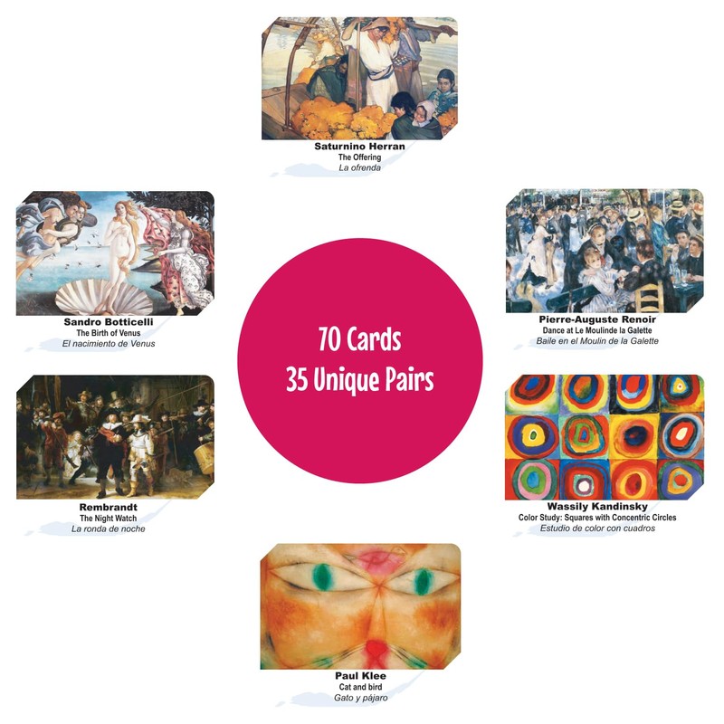 • 35 matching pairs with a variety of the paintings from famous artists like Van Gogh, Renoir, Degas, Vermeer, Da Vinci and more. Each artwork is accompanied by the artist’s name and the title of the painting in English and Spanish.