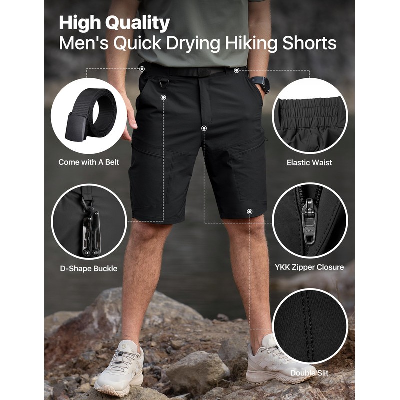 Mens Cargo Hiking Shorts Water Resistant Quick Dry Lightweight Breathable Tactical Shorts with Zipper Pockets & Nylon Belt Black 34W10L