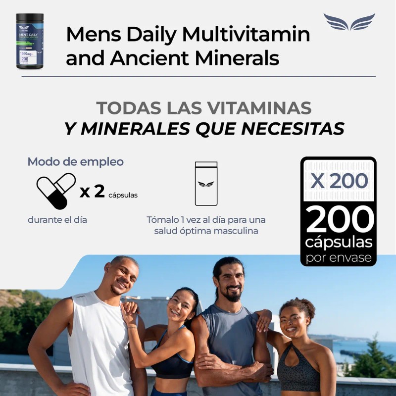 MENS DAILY MULTIVITAMIN AND ANCIENT MINERALS 4 en 1, 200 capsulas (1560mg por porcion) con Vitaminas, Minerales, Adaptogenos y Aminoacidos