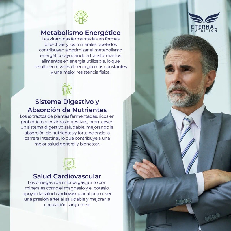 Las vitaminas en formas bioactivas y fermentadas son altamente absorbibles asegura que los nutrientes esenciales sean directamente disponibles para las células, lo que es crucial para optimizar las funciones celulares, desde la producción de energía hasta la reparación y regeneración celular. Esto sustenta directamente el rendimiento físico y mental, al asegurar que las células trabajen de manera eficiente y efectiva.