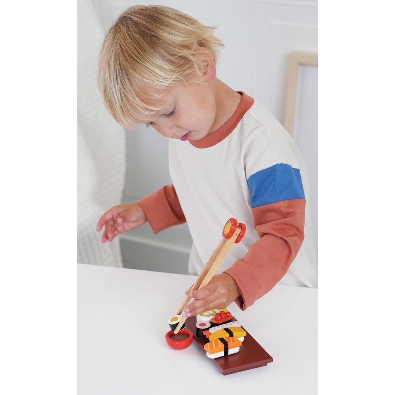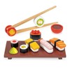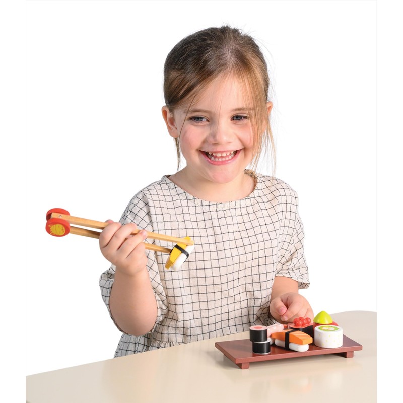 • CHOPSTICKS MADE EASY - Made from sustainable wood with non-toxic paint, this is an eco-friendly toy fit to spark the culinary imagination. The set comes with 7 sushi pieces, wasabi, soy sauce, kid-friendly chopsticks and a platter. Product size 6.69 x 2.95 x 1.77 inches.