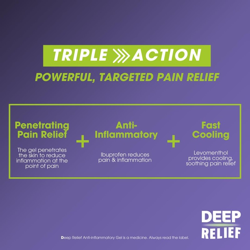 - TRIPLE ACTION FORMULA: Combining the power of ibuprofen and levomenthol, this gel starts to work in 10 minutes - providing fast cooling relief, and works to reduce inflammation and ease pain.