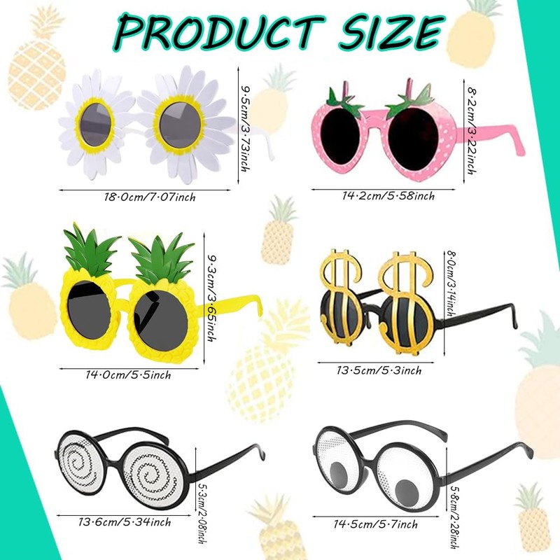 - LUO PARTY SUNGLASSES These luau style glasses are perfect for beach parties and include 6 different pairs of luau styles including strawberry, pineapple, dollar, flowers, stunner, eyeball. Perfect for summer beach parties, pool parties, luau parties, suitable for adults and children.