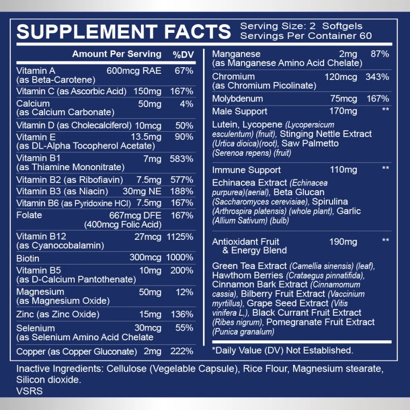 ULTRA POWERFUL FORMULA: Our Men's Daily Multivitamin is made up of 4 unique ingredients: Vitamin & Mineral Blend, Unique Men's Support Formula, Fruit & Energy Blend, and Immune Support Blend. These work together to provide you with energy and health every day.