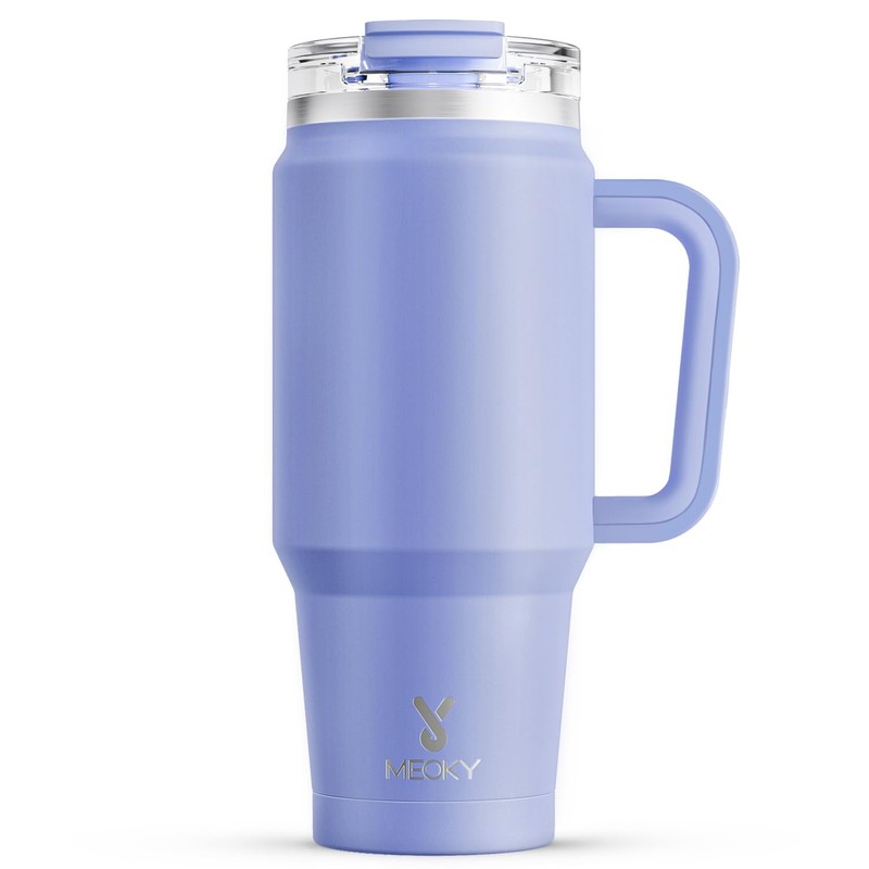 Meoky - Vaso de 32 onzas con asa, vaso aislado con tapa y popote, taza de viaje de acero inoxidable, mantiene el frío durante 24 horas, 100% a prueba de fugas, cabe en portavasos de coche (Lila)