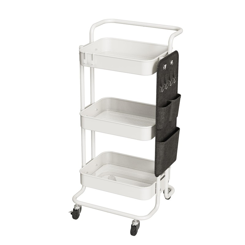 Merapi 3 Tier Metal Rolling Cart with Table Top, Lockable Wheels & Side Bags, Utility Cart for Teachers, Rolling Storage Cart, Art Craft Cart with 4 Hooks for Kitchen Bathroom Office Classroom White