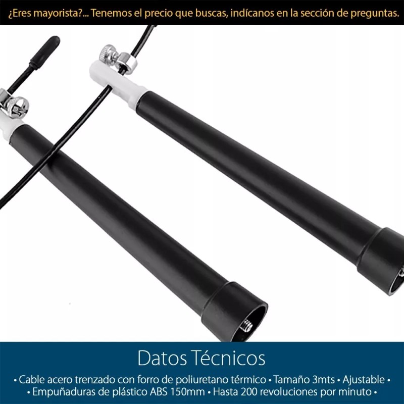 Cuerda para saltar profesional de alta velocidad de 3 metros con empuñaduras de plástico ABS de alta resistencia ajustables y cable de acero trenzado ligero con forro de poliuretano térmico, soporta hasta 200 revoluciones por minuto. Es ideal para crossfit.