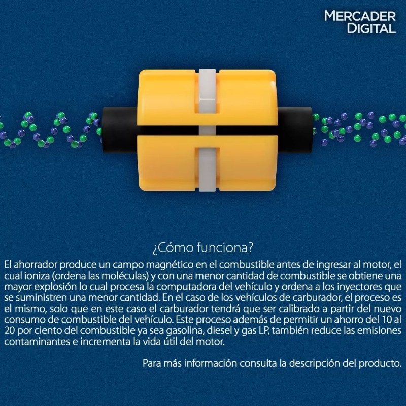 El ahorrador produce un campo magnético en el combustible antes de ingresar al motor, el cual ioniza (ordena las moléculas) y con una menor cantidad de combustible se obtiene una mayor explosión, lo cual procesa la computadora del vehículo y ordena a los inyectores que se suministren una menor cantidad de combustible. En el caso de los vehículos de carburador, el proceso es el mismo, solo que en este caso el carburador tendrá que ser calibrado a partir del nuevo consumo de combustible del vehículo. Este proceso además de permitir un ahorro del 10 al 20 por ciento del combustible ya sea gasolina, diesel o gas LP, también reduce las emisiones contaminantes e incrementa la vida útil del motor.