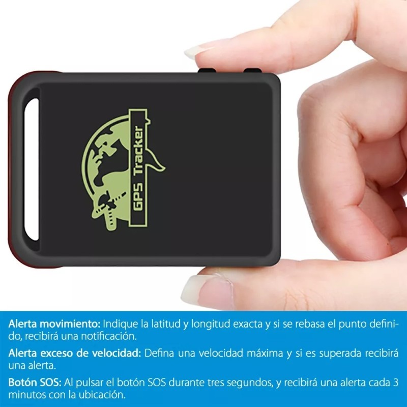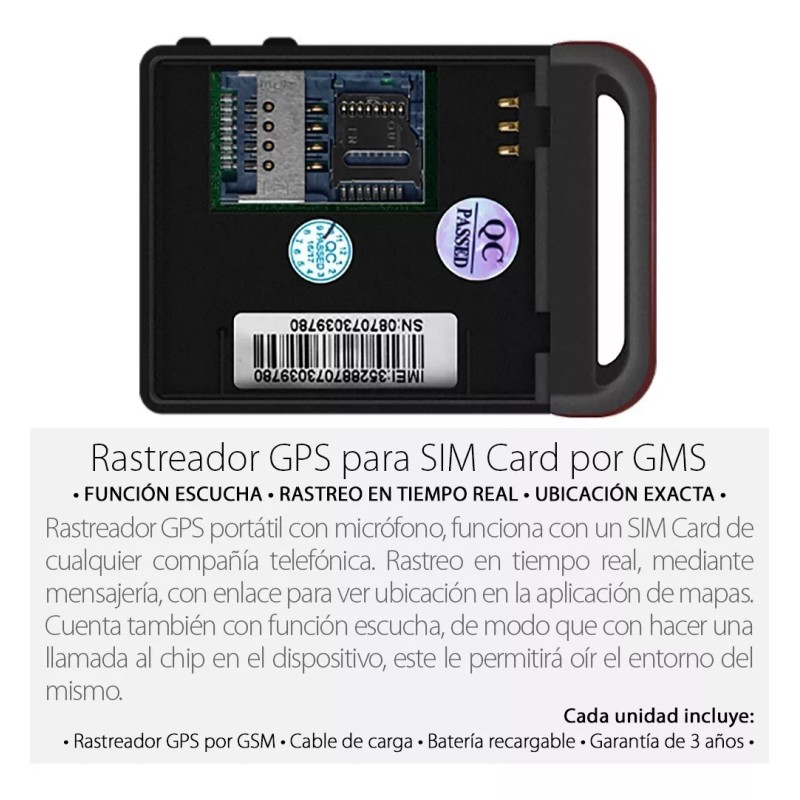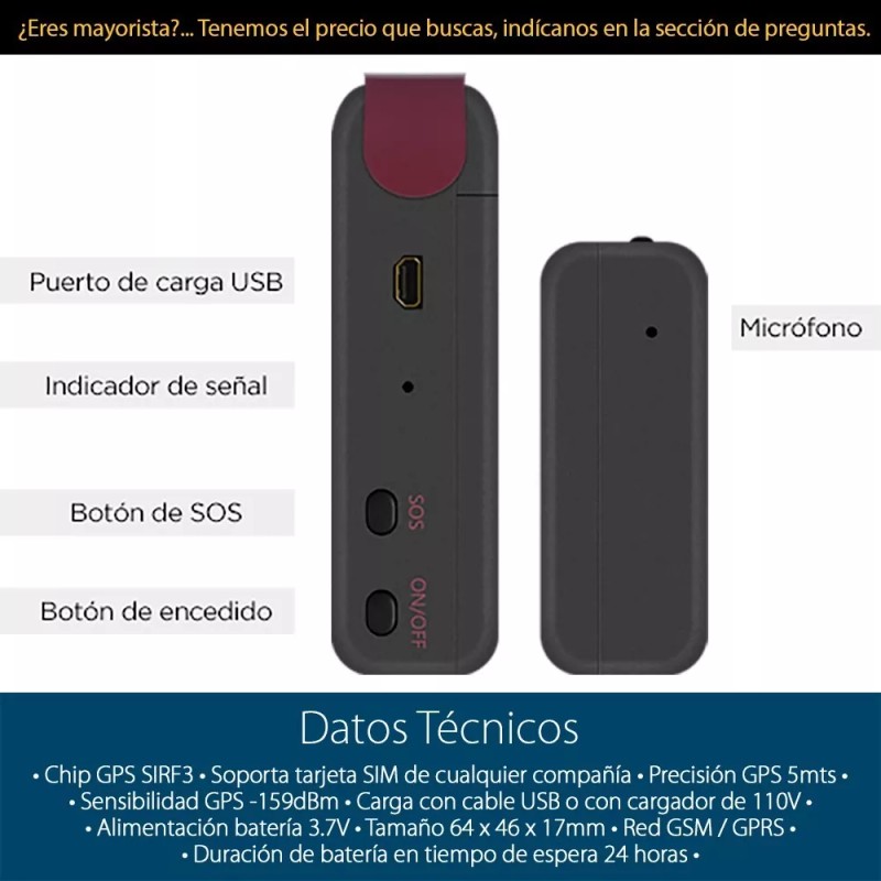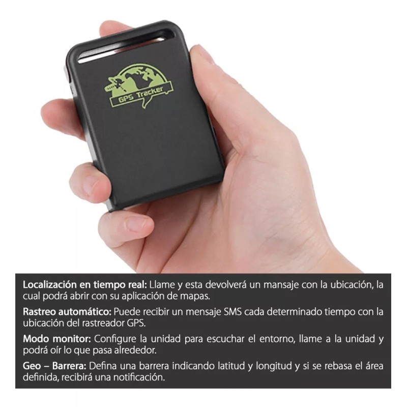 Rastreador GPS portátil con micrófono, funciona con un SIM Card de cualquier compañía telefónica. Rastreo en tiempo real, mediante mensajería, con enlace para ver ubicación en la aplicación de mapas. Cuenta también con función escucha, de modo que con hacer una llamada al chip en el dispositivo, este le permitirá oír el entorno del mismo.