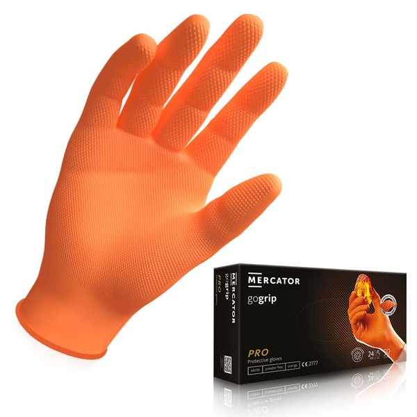 Mercator GoGrip Nitrile Gloves, Orange, Disposable Gloves, Powder-Free Disposable Gloves, Size: M - Pack of 50, latex-free, 2 x thicker nitrile gloves, diamond texture