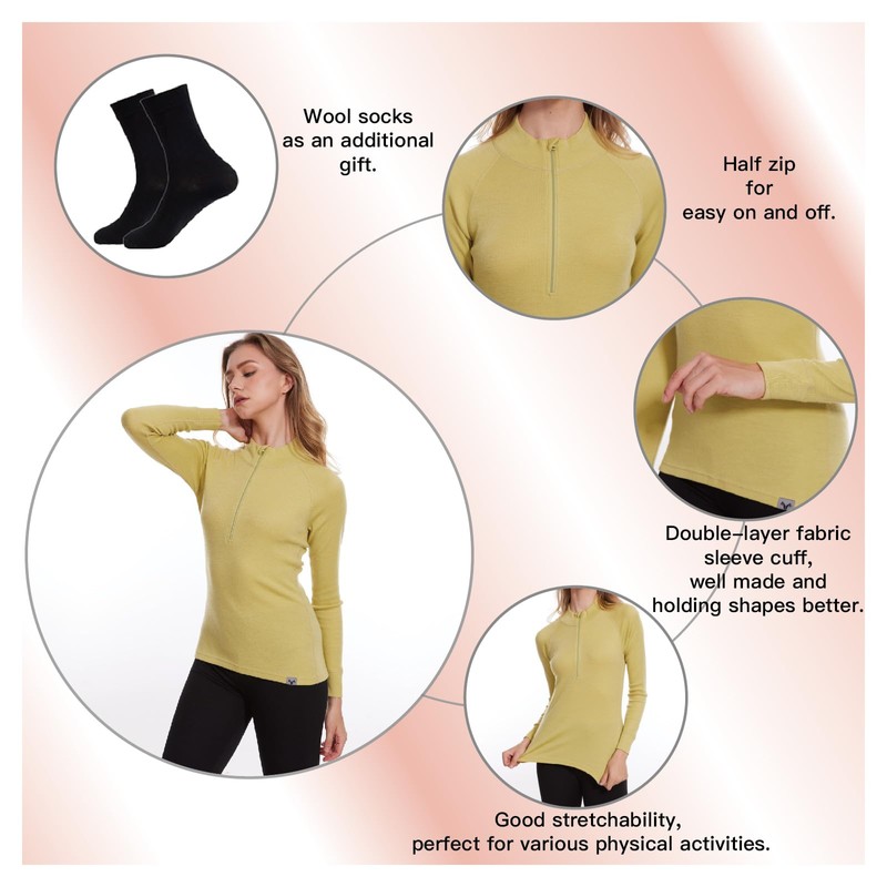 - ULTRA SOFT & COMFORTABLE-The merino wool base layer top are designed in midweight 240 g/m2 fabric, superfine 19.5 Micron Merino Wool next to skin provides all day comfort without itch. Package Includes:A Merino Quarter Zip Sweater+A Pair of socks