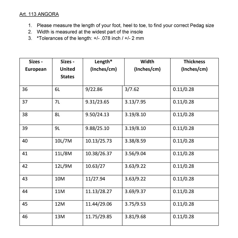 • Product Specifications: Size: Women’s 34 / 35 - 40 (22.5 - 25.5) * Men’s 39 - 45 (24.5 - 29.0); Country of Origin: Germany; Material: Surface: 100% Merino wool; Back: Latex (non-slip dots). Suitable for shoes, pumps, boots, etc