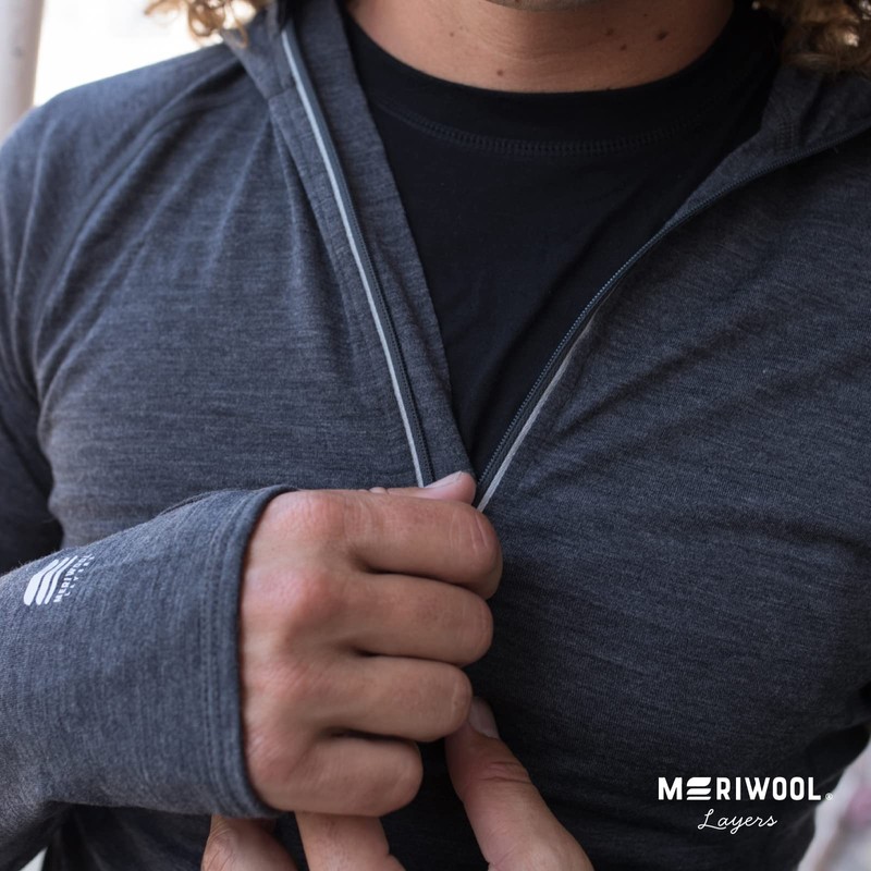 MERIWOOL Men’s Base Layer Hoodie Lightweight Merino Wool Long Sleeve Thermal is the perfect choice for active individuals who need to stay dry and comfortable. Designed with athletes in mind, its quick-drying and ultra-breathable features make it great for running, sports, or the gym. The hood and thumb holes help provide added warmth during cold weather and the half-zip design keeps you cool when things heat up. Made with a 16.5 micron jersey knit, our athletic sweater is super-soft with no itch, and can be worn as an indoor or outdoor layer. Additionally, Merino wool’s wicking and odor-resistant properties keep you dry through the process of wicking, making this men’s thermal t-shirt a must-have in any man’s closet. Get the warmth and comfort you need during any season with the MERIWOOL Men’s Base Layer Hoodie Lightweight Merino Wool Long Sleeve Thermal.