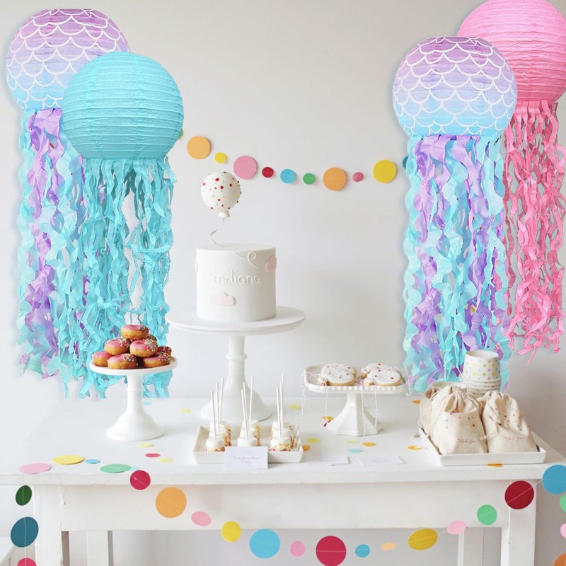 - 【Package】:The blue pink purple jellyfish paper lantern set contains 6 paper lanterns (2 blue + 1 pink + 1 purple + 2 mermaid colors).Diameter of lantern 10 inches. These colorful jellyfish paper lanterns unique characteristics and beauty,liven up your party atmosphere.