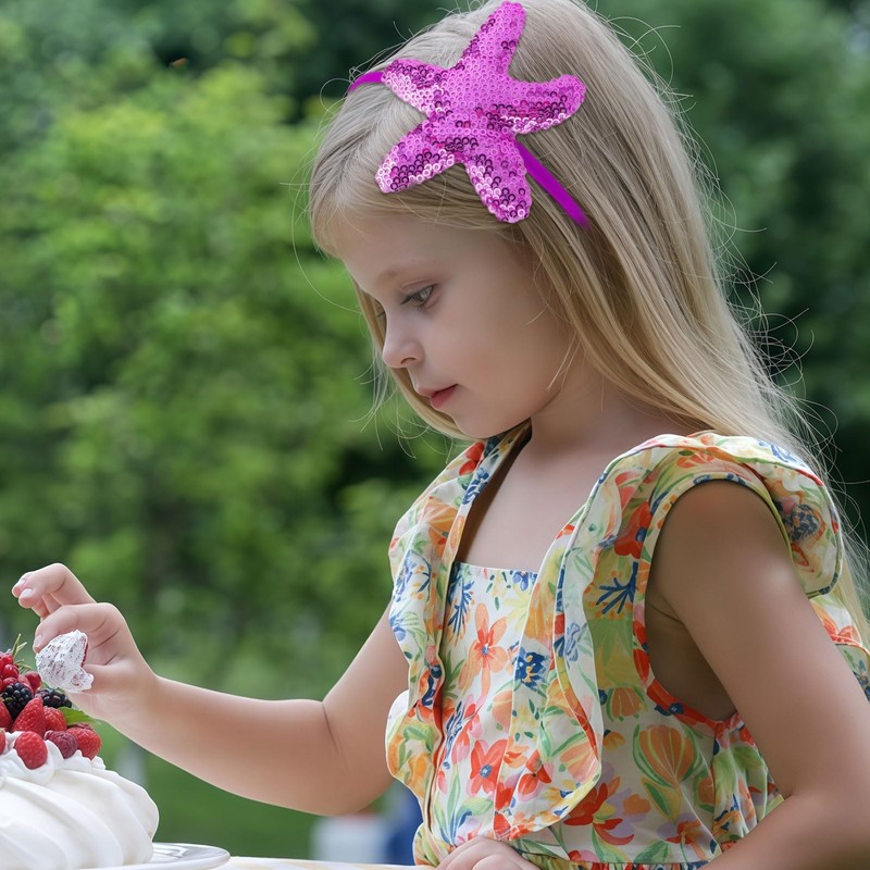 - 【Dazzling Mermaid Starfish】Purple holographic sequin starfish design creates magical aurora effects under sunlight, transforming little girls into sparkling mermaids! 6 gradient ocean hues (Purple/White/Pink/Gold/Blue/Lavender) coordinate with summer outfits.