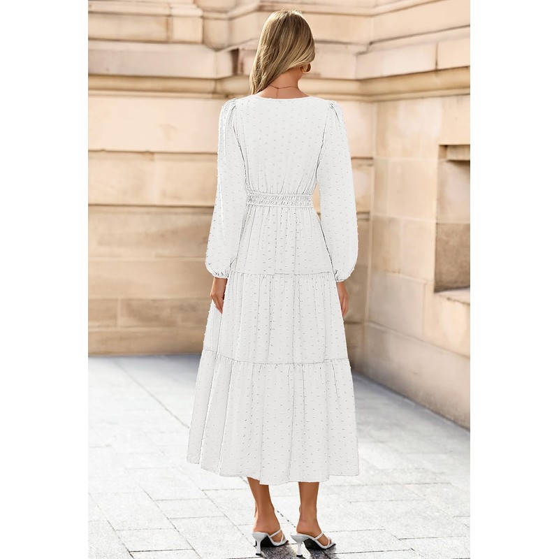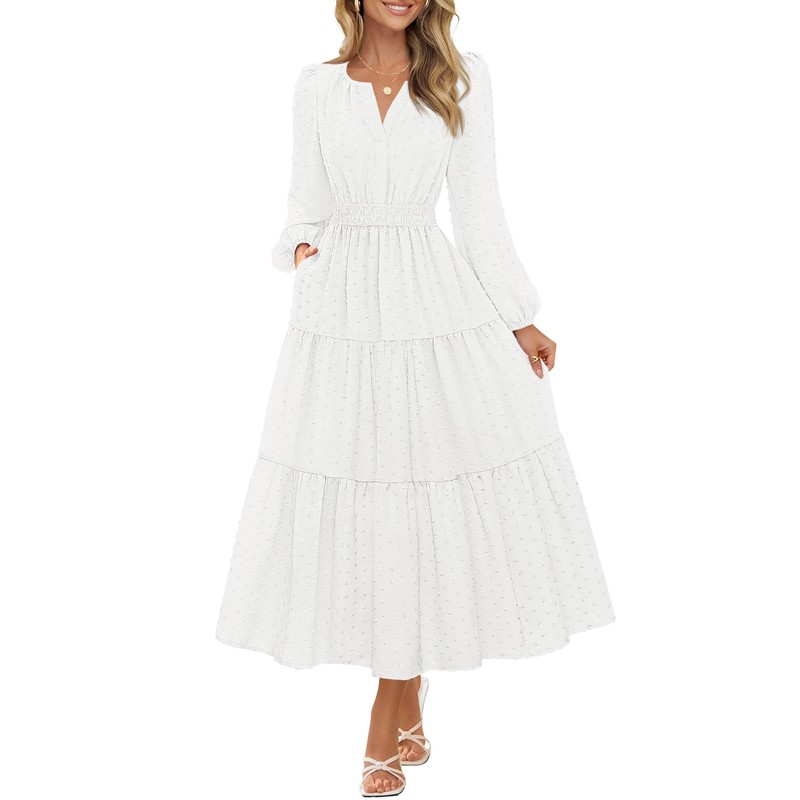 - Features: Our casual dress is designed with a notch v neck, long puff sleeves, elastic high waist and cuffs, two side pockets, an a-line shape, tiered hemline, solid color, and Swiss dots to enhance the overall fashion. Dresses for women 2025 elegant classy