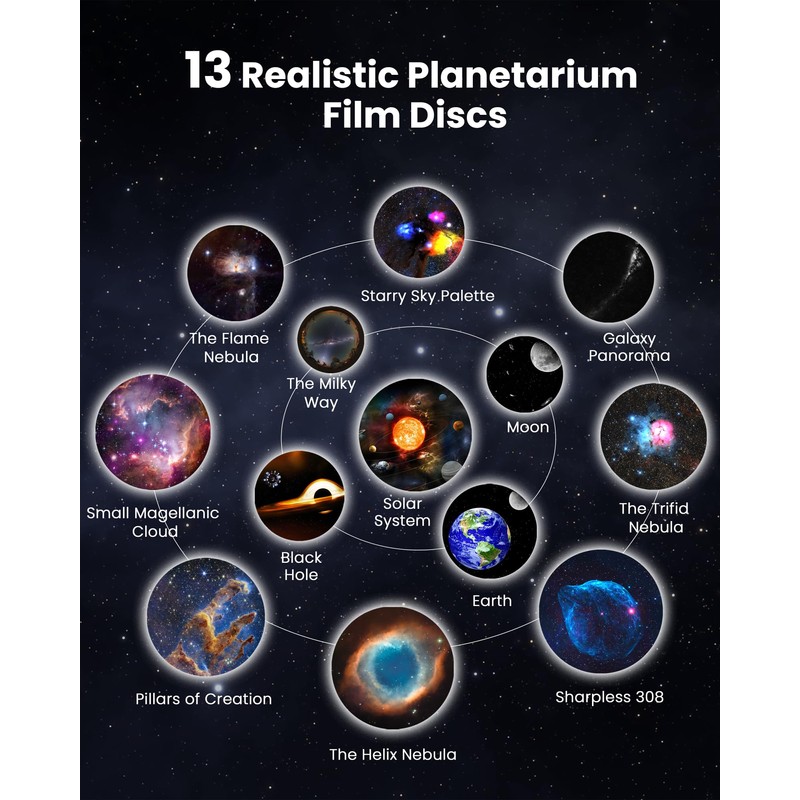 - 【13 IN 1 Vivid Galaxy Projector】The astronaut galaxy comes with 13 different 4K HD film discs, such as Solar System, Sharpless 308, Starry Sky Palette and the Helix Nebula and so on. Whether in the bedroom, living room, home theater or outdoor camping, it can bring you 13 extraordinary space journeys, allowing you to be in the Milky Way anytime, anywhere and explore the mysteries of the universe with your family.