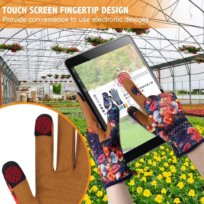 - TOUCH SCREEN DESIGN GARDENING GLOVES - The work gloves women with special touch screen design, which more humanization and ergonomic. Can answer the phone anytime without put off your yard gloves while garden working.