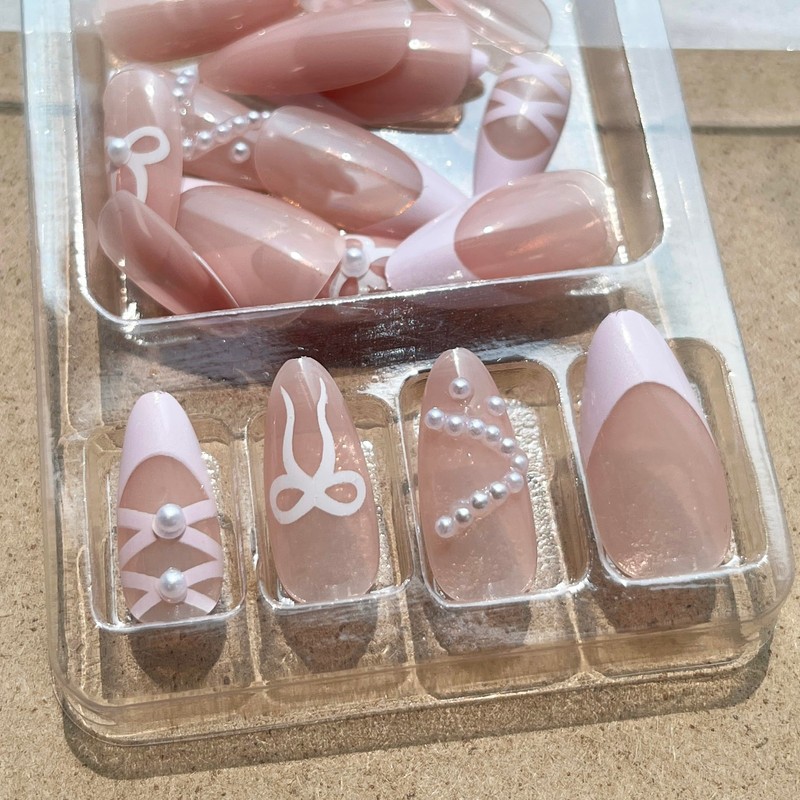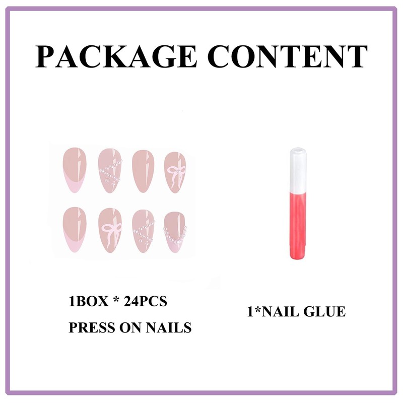 MERVF Almond Press on Nails Medium Fake Nails Pink French Tip Glue on Nails Bow Pearls Press ons Stiletto Acrylic False Nails with Cute Design Glossy 24pcs