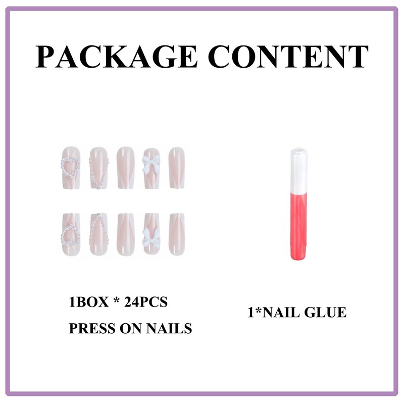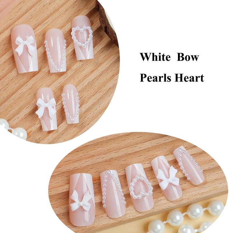 MERVF Long Square Press on Nails Fake Nails White French Tip Glue on Nails 3D Heart Bow Charms Press ons Acrylic Nails with Pearls Design Squoval False Nails for Women Glossy 24pcs
