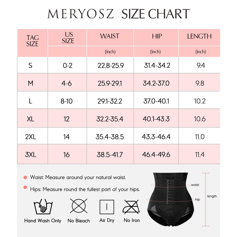 - WARM TIPS FROM MERYOSZ BUTT LIFTING SHAPEWEAR: The waistline for each size: S (22.83-25.98 inch), M (25.98-29.13 inch), L (29.13-32.28 inch), XL (32.28-35.43 inch), 2XL (35.43-38.58 inch), 3XL (38.58-41.73inch). To fit well, please measure yourself and refer to our shapewear underwear tummy control SIZE CHART in the left picture before you order.
