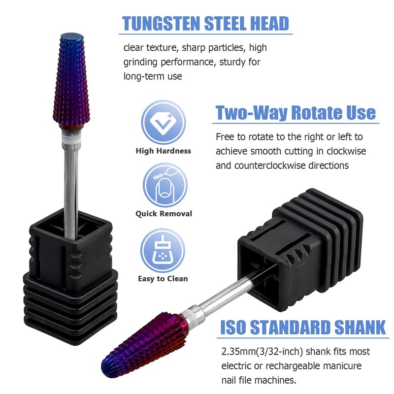 - Carbide Nail Bits - Made of tungsten carbide material with purple plated for excellent heat dissipation, low vibration, low noise, and hard-wearing
