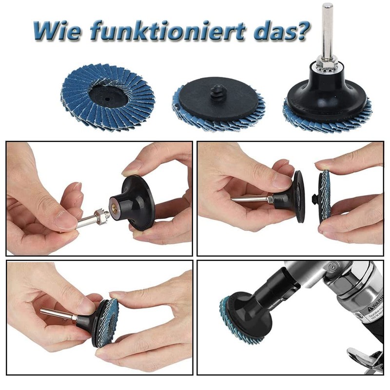 • Flap discs assortment: diameter: 50 mm / 2 inch; grit: 40 / 60 / 80 grit (5 pieces of each grit); holder rod diameter: 6.3 mm / 1/4 inch.