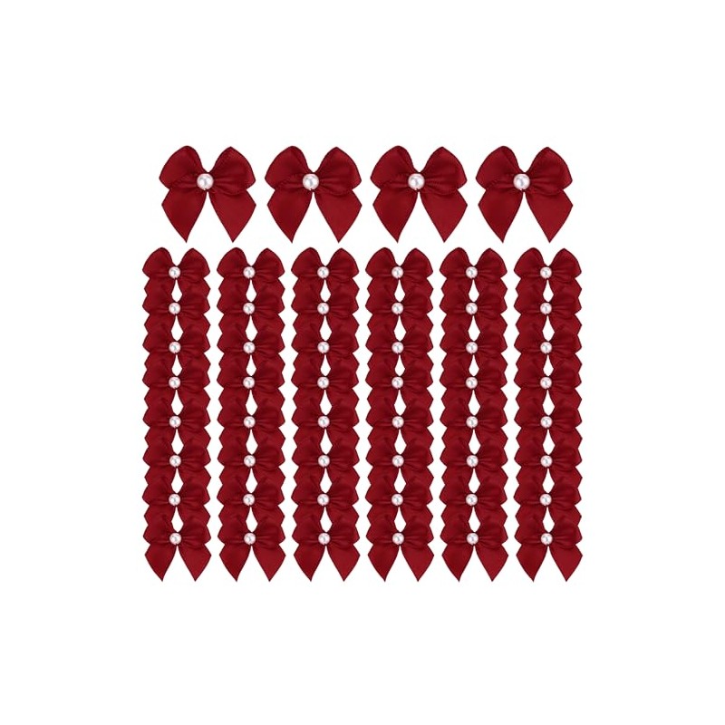 - About Size :mini burgundy satin ribbon bows with pearl measures about 2.5x 2.5cm/1 x1inch, the proper size makes it an eye-catching decorative ornaments . Use them to give your wrapping bags or boxes an outstanding look on your holiday party that will create a cheerful festive atmosphere