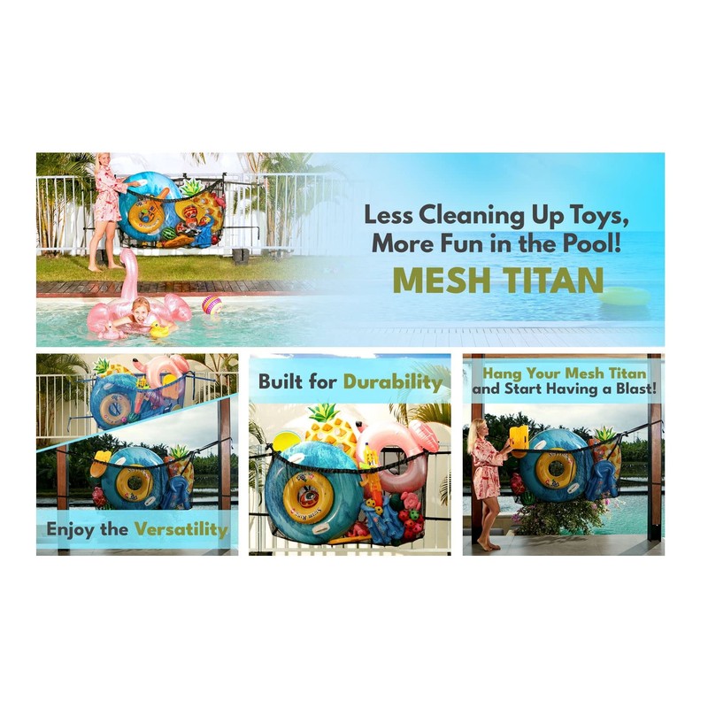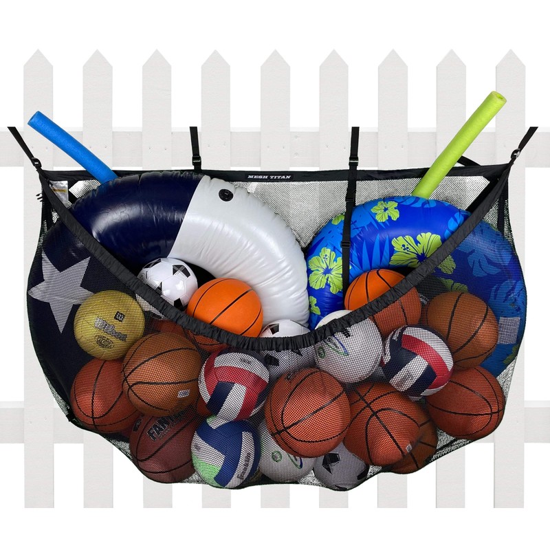 - The MESH TITAN is the original and only hanging outdoor pool float organizer that can efficiently hold more pool inflatables than a 150 GALLON covered deck box