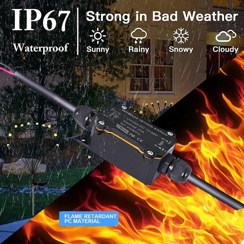 - 【IP67 Watertight construction】This remote control switch features IP67 grade waterproof design,with excellent waterproof performance.Whether for indoor or outdoor use, it excels in enduring wear, humidity, cold, and sunlight. It is perfect to use it as an outdoor switch for patio and garden. NOTE:Please don't soak it in water.