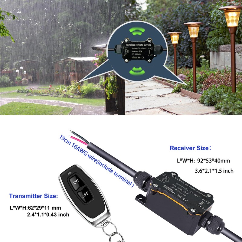 - 【Excellent Design】Rating of this remote switch is 20A 12V, which is heavy duty. It can handle 20A high current.Stable and reliable performance with high reception sensitivity (> - 97dBm). Strong signal can pass walls, floors, doors.It can be controlled within about 328ft distance.widely used for high power electrical appliances and outdoor electrical appliances.