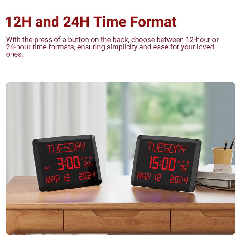 - Ease of Setup with Intuitive Button,12/24 Hours,DST------𝗗𝗮𝘆 𝗖𝗹𝗼𝗰𝗸 with separate buttons and clearly button name for each feature.very easy to set and use without user guide.Even kid,the elderly,old parent can set up themselves.with a choice of 12/24 Hours time format by sliding the switch on the back.