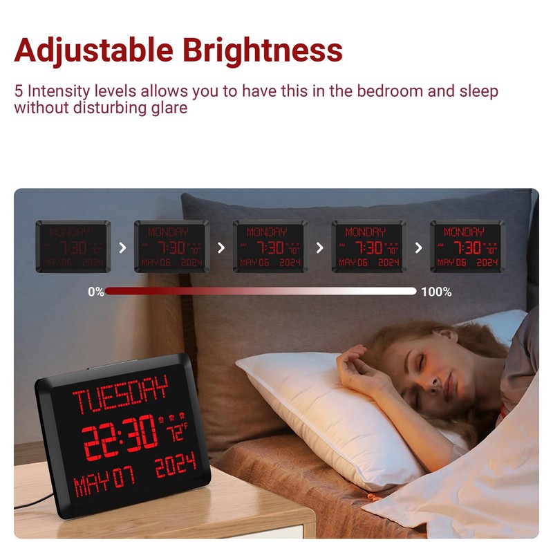 - 11.5”Extra Large 𝗗𝗶𝗴𝗶𝘁𝗮𝗹 𝗪𝗮𝗹𝗹 𝗖𝗹𝗼𝗰𝗸 with 5 Intensity Levels------Time,date,week and indoor temperature in large,clear white letters on the black display,Highly Visible for Memory Loss,the elderly and the impaired vision,can easily read it from anywhere in your whole living room without putting glasses on.5 brightness Levels allows you to have this in the bedroom and sleep without disturbing glare.