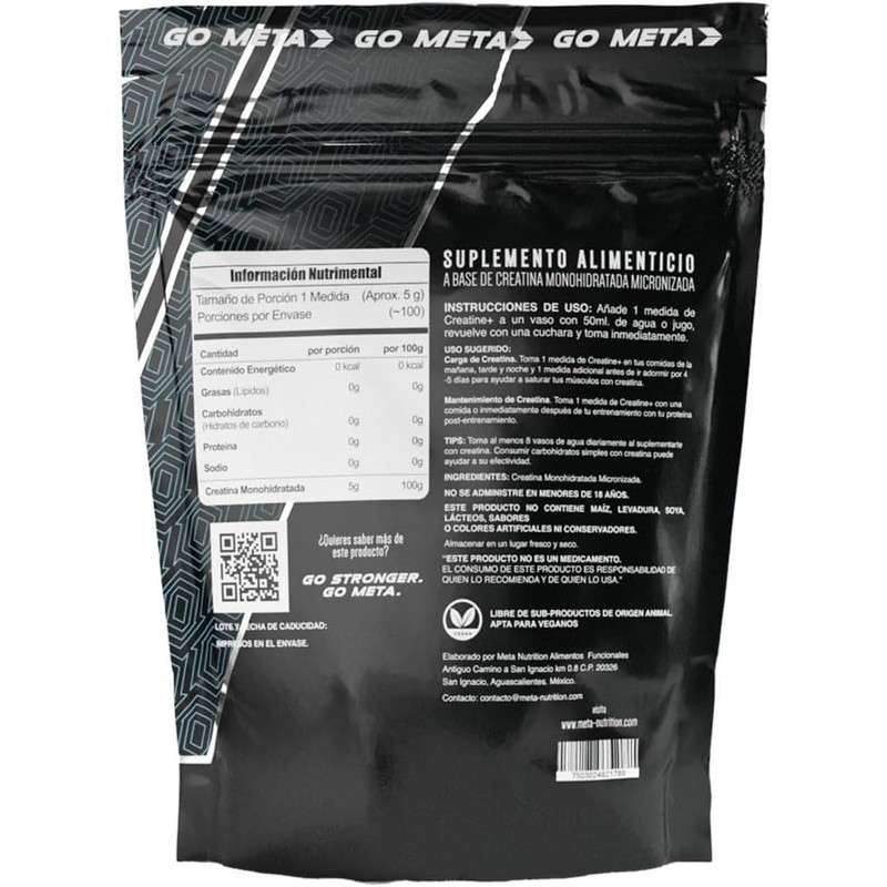 Meta Nutrition Creatina Monohidratada Creatine - 500 Gr, 100 Porciones, con Scoop incluido