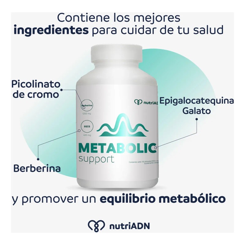Metabolic Support by nutriADN es un suplemento avanzado diseñado para apoyar y equilibrar el metabolismo de forma natural. Con una cuidadosa selección de aminoácidos, minerales y potentes antioxidantes como el EGCG (un potente antioxidante del té verde que apoya el metabolismo y el control de peso), este producto ayuda a optimizar el funcionamiento metabólico, promoviendo un equilibrio saludable y un estilo de vida activo. Ideal para quienes buscan cuidar su salud desde dentro, Metabolic Support es una fórmula completa, libre de gluten y apta para veganos.