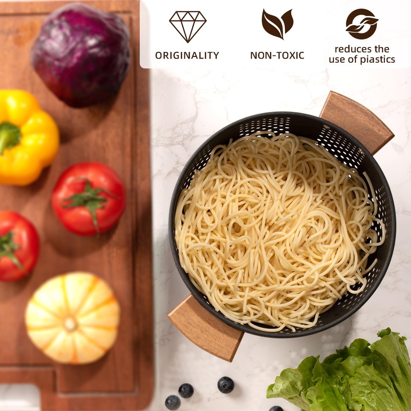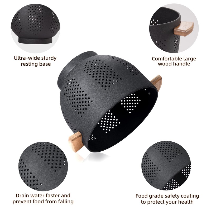 Metal Colander with Wood Handle, Powder Coated Kitchen Essential 22cm Metal Strainers,Large Kitchen Strainer with Stable Base Perfect for Pasta, Fruits,Vegetables (Matte Black)