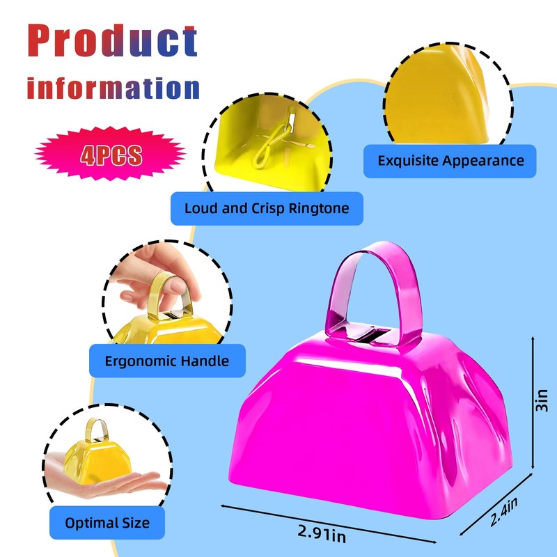 Metal Cow Bell Noise Maker - 3 Inch Pack of 4 - Small Loud Metal Cowbell Noisemaker with Handle - Noisemakers Great for Football Games, Sporting Events (Pink+Yellow+Red+Blue)