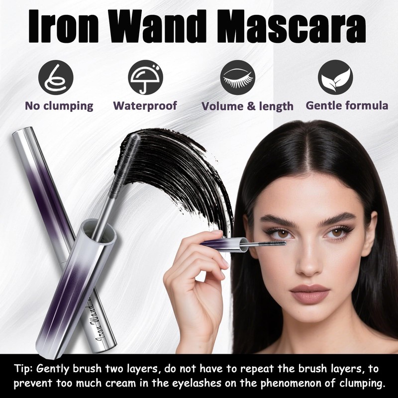 - 【Den Ganzen Tag Lang Lockig】 Iron Wand Mascara Schwarz sorgt dafür, dass Ihre Wimpern den ganzen Tag lang voluminös und geschwungen bleiben, ohne zu hängen oder sich zu verziehen. Die innovative Formel verdichtet und verlängert nicht nur die Wimpern, sondern sorgt auch für einen perfekten 3D-Schwung.