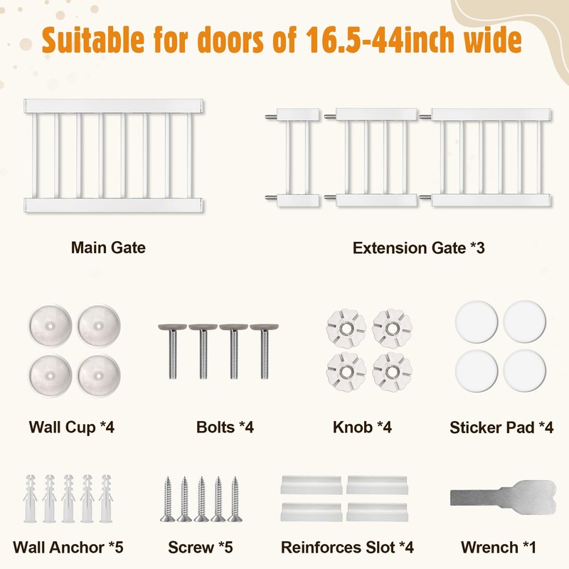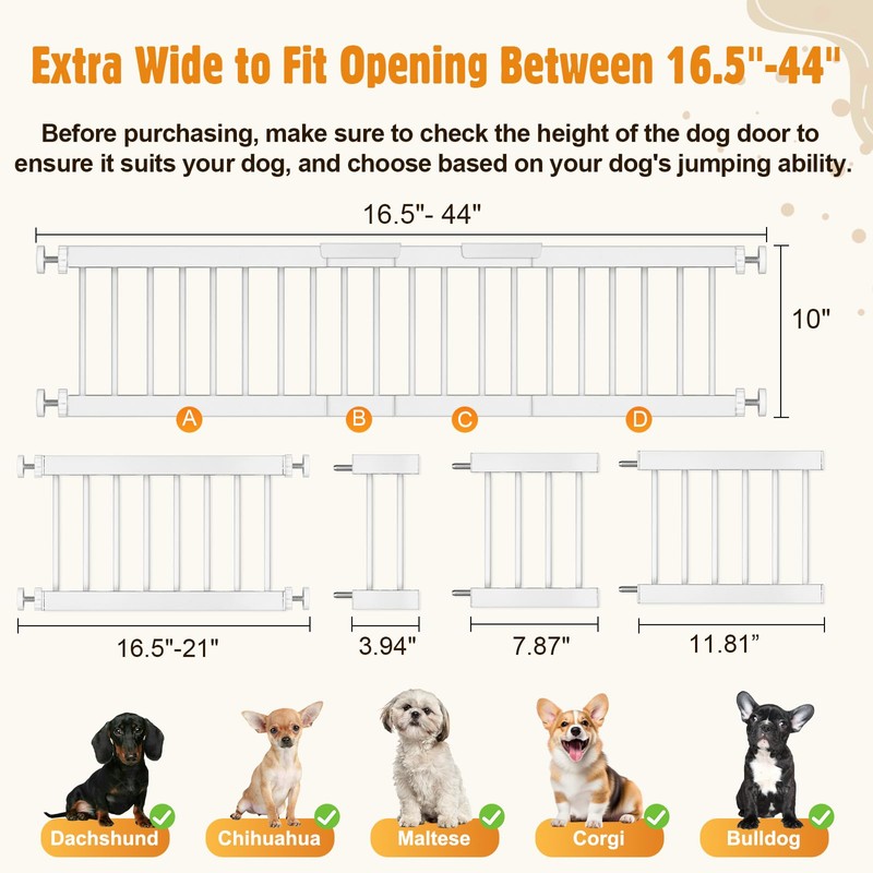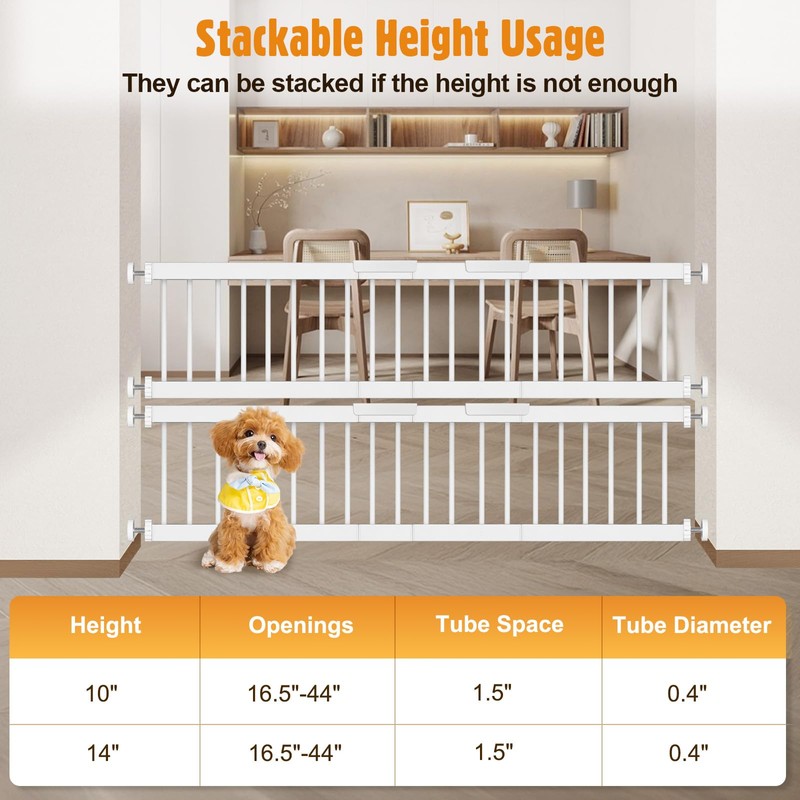 • 【Fits 16.5-44inch Openings】Expand to fit 16.5-44inch wide opening, stand 10 inches high. Suitable for doorways, hallways, and stairways to protect small pets. Please measure your opening prior to purchasing to ensure the gate fits properly