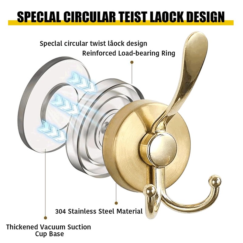Metal Suction Cup, Heavy Duty Double Hooks for Bathroom, Kitchen, Wall, Cabinet, Car - 2 Pack, Rustproof & Waterproof Adhesive Hooks for Organizing Towels, Keys, Coats, Hats (Gold)