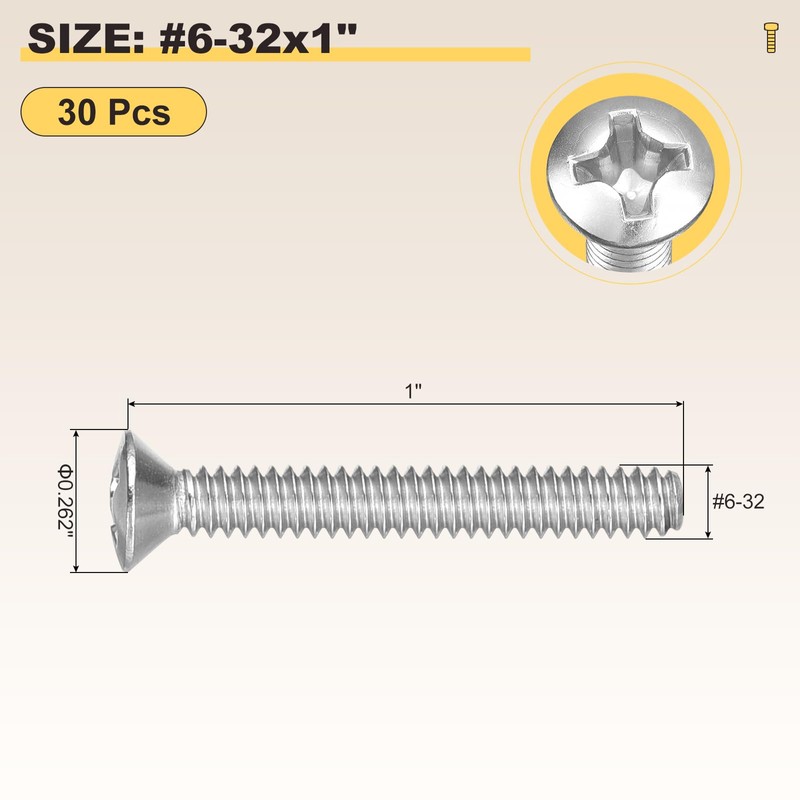 - [2]: SPECIFICATION: Product Name: Cross recessed semi countersunk head screws; Thread Diameter: #6-32(Thread Dia x Pitch); Screw Length(inch):1"; Head Diameter(inch): 0.262"; Color: Silver; Material: 304 Stainless steel; QUANTITY INCLUDED - 30Pcs x Oval Head Phillips Machine Bolts