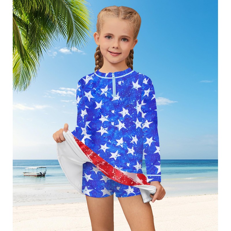 Meteorito Girls Rashguard Swimsuit Two Pieces Long Sleeve Bathing Suit Flag Forth 4th of July Zipper Skirt with Shorts