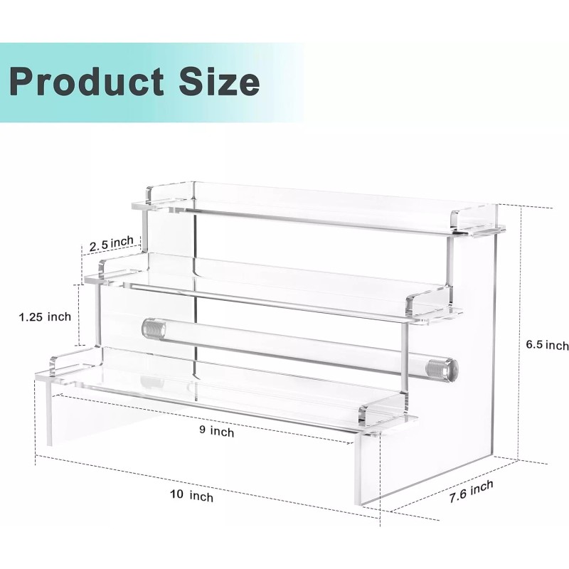 • EASY TO INSTALL - After installing the cylindrical legs, insert the step panel in turn to complete the installation work. The small baffles around and behind each layered board prevent your items from falling. More big and reasonable cylindrical support legs set in the display stand, which improves the stability of the transparent acrylic display risers. (You can even hang large earrings on the cylindrical legs!)