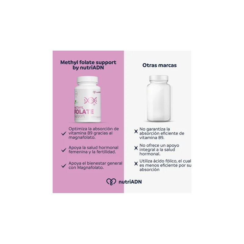 Methyl Folate Support es tu aliado perfecto para mejorar la producción de neurotransmisores, reduciendo migrañas y mejorando la química cerebral para un mejor estado de ánimo. Formulado con Magnafolato, la forma más absorbible y estable del metilfolato, y Colágeno Hidrolizado, este suplemento ofrece múltiples beneficios para la salud hormonal, cardiovascular y general.