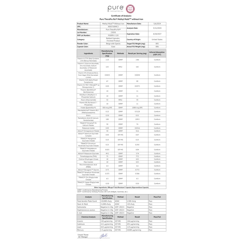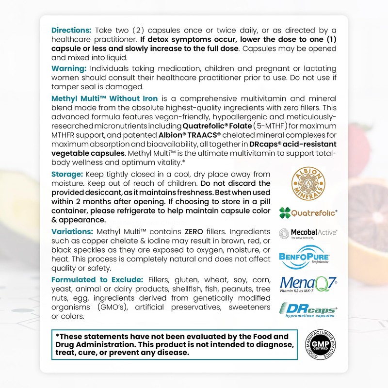 Methyl Multi Without Iron Methylated Multivitamin for Men & Women, 60-Day Supply | Methyl B12 & Methylfolate (5-MTHF) for MTHFR Support | Pharma Grade Multivitamin & Multimineral For Health, 120 Caps