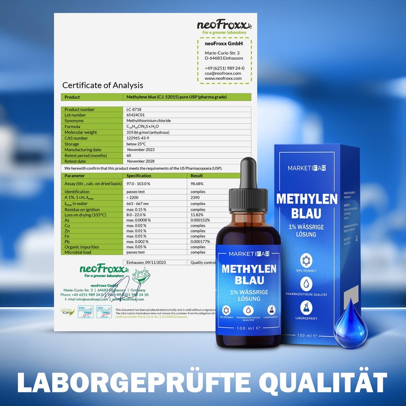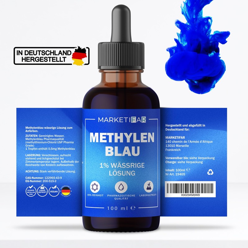 - German production - Produced and packaged in Germany. Our methylene blue is laboratory tested and guarantees reliable pharmaceutical quality.