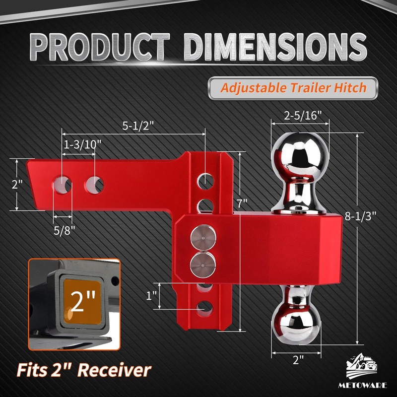 METOWARE adjustable trailer hitch that’s meticulously crafted to work with all 2“×2” receivers for all your towing needs. Features up to 14,000lbs towing capacity and maximum 8” adjustable height, 4’’, 6’’, 8’’up or down adjustment with 2" and 2-5/16” balls available for your needs.Our hitches are available for vehicles of different heights and are universally compatible with vehicles with standard 2" receivers.