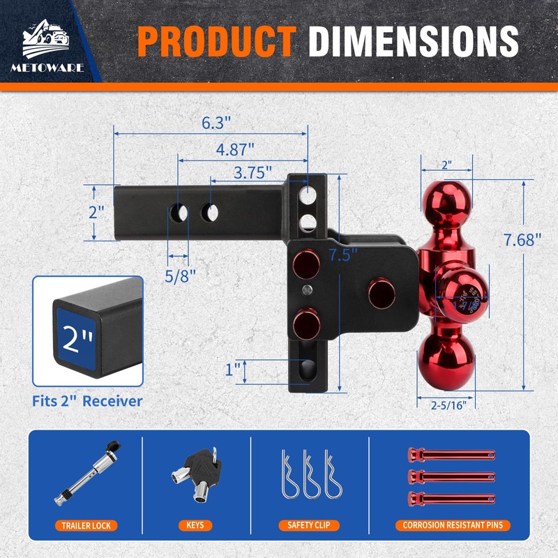 METOWARE adjustable trailer hitch that’s meticulously crafted to work with all 2“×2” receivers for all your towing needs. Features up to 12,500lbs towing capacity and maximum 8” adjustable height, 4’’, 6’’, 8’’up or down adjustment with 1-7/8'', 2" and 2-5/16" balls available for your needs. Our hitches are available for vehicles of different heights and are universally compatible with vehicles with standard 2" receivers.