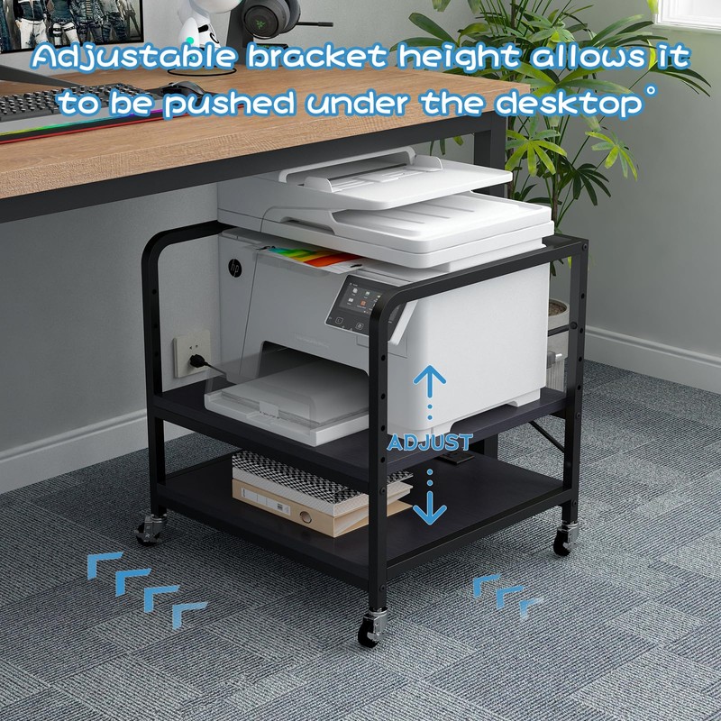 - 【Adjustable Top Shelf and Built-in Power Outlets】 Printer table with charging station contains 2 power outlets and 2 USB charging ports. The adjustable printer stand offers a removable and height-adjustable top shelf with 5 levels, allowing you to customize the clearance space under the desk for printers of various sizes.